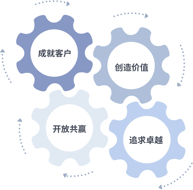成就客户是一切决策的出发点,,,,创造价值是衡量所有工作的标准,,追求卓越是赢博做事做人的态度,,,开放共赢是赢博的格局也是最终的结果。。。。价值观的齿轮环环相扣,,推动着组织里的每个人不断向前。。